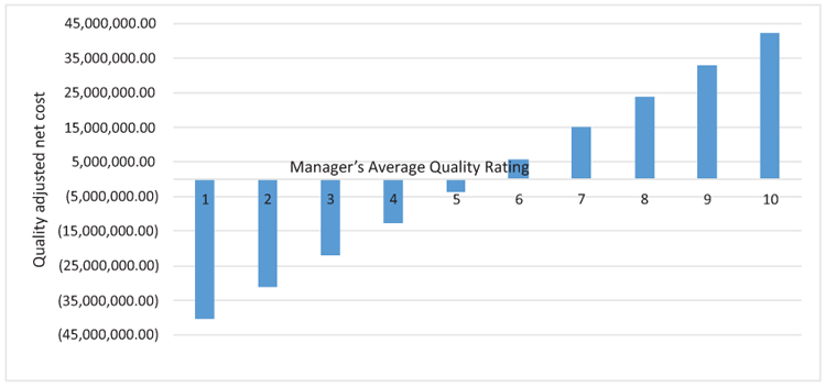 Given that the manager’s service quality rating had a significant impact on the net cost benefit, we conducted an analysis to determine the quality rating below which outsourcing would not be cost beneficial to the hospital compared to insourcing. Fig. (3) shows the impact of the managers' quality of services perceptions on the net total cost of outsourcing cleaning services.